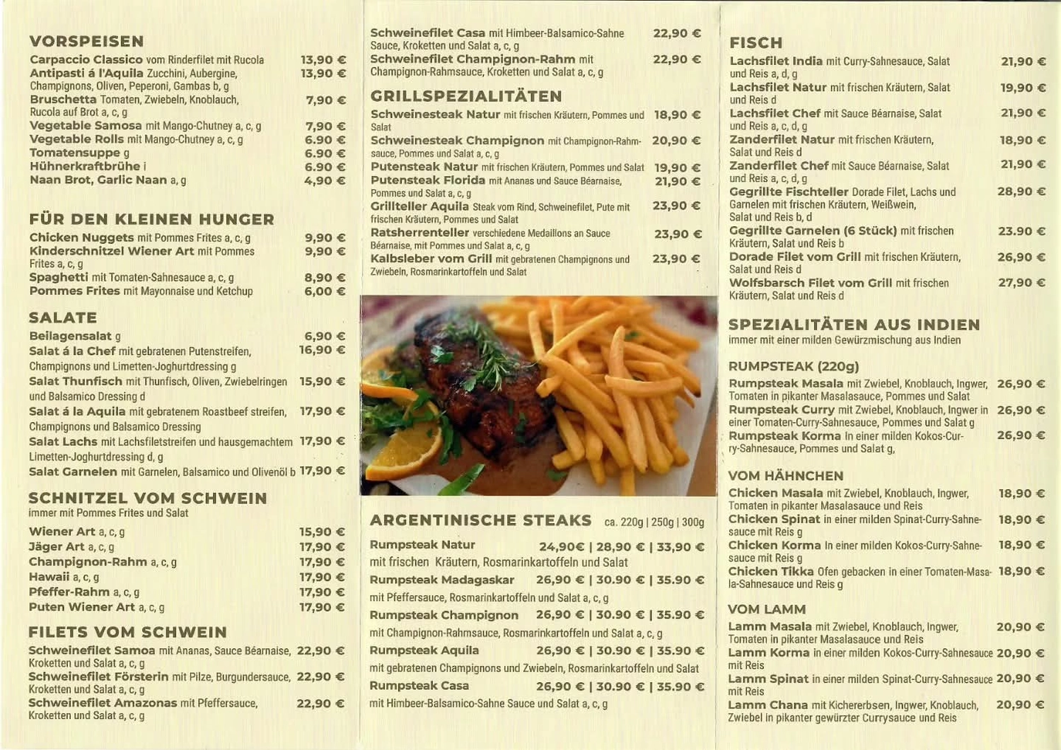 Steak vom Rind, Schweinefilet, Pute mit frischen Kräutern, Pfannengemüse, Pommes und Salat